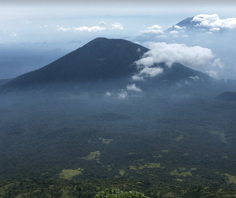 The trek passes through bamboo forests and lush vegetation until reaching the summit, where a spectacular crater lake awaits, shrouded in mist and silence. Along the way, it is possible to spot primates and birds native to this high-altitude ecosystem.
